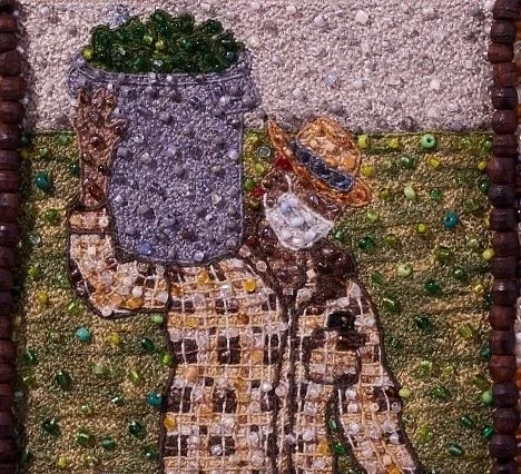 cotton and silk thread, metallic silver thread, vintage glass seed and bugle beads, green tigers eye, antique silver leafed globes