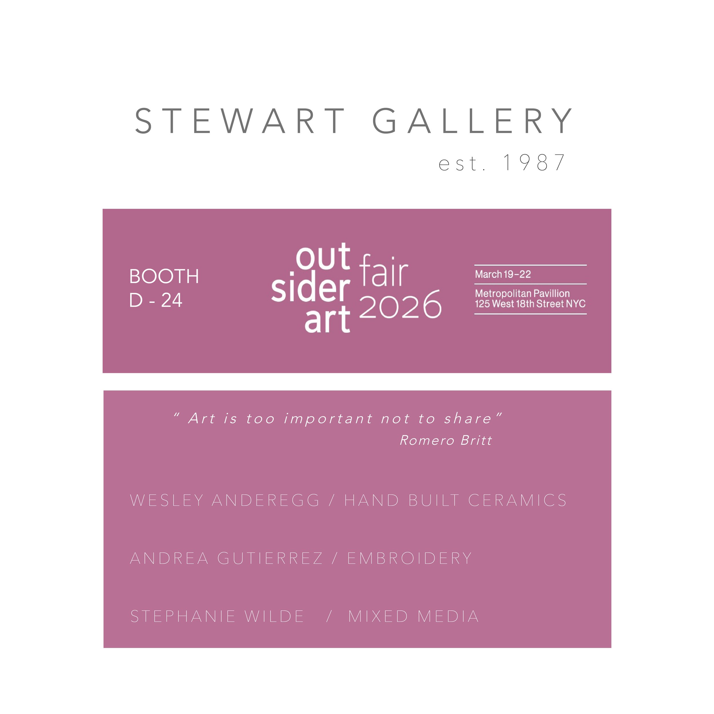 Please note the Gallery will be closed while we participate in our 12th year at the New York Outsider Fair.